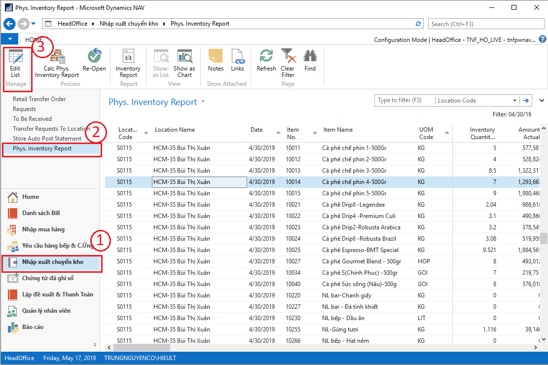 Vào Nhập xuất chuyển kho ==> Phys. Inventory Report ==> chọn vào Edit List để chọn lý do chênh lệch.
